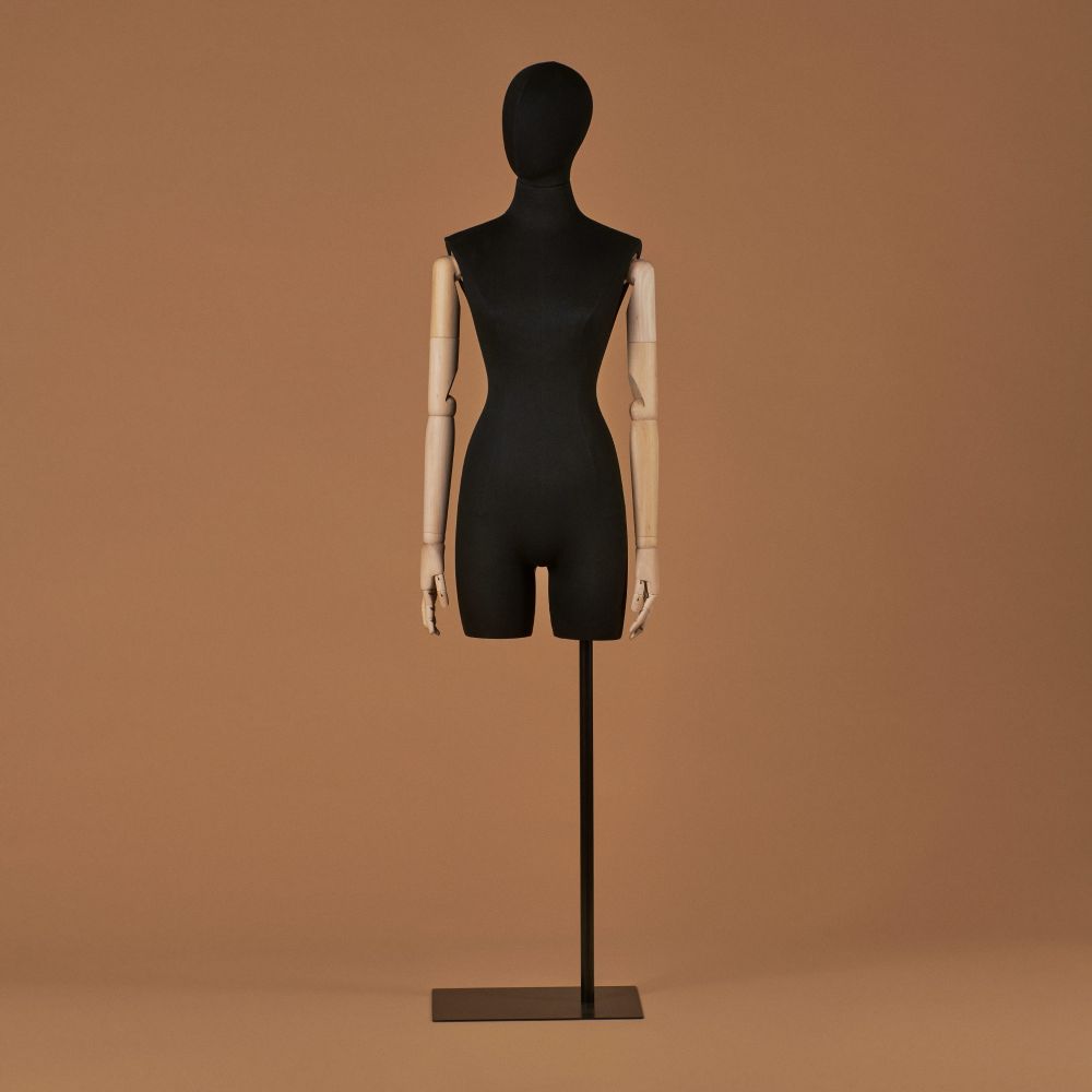 Die beweglichen Holzarme der Schaufensterpuppe ermöglichen verschiedene Stellungen. Der ovale, leicht nach oben gerichtete Kopf, unterstreicht die Stärke der weiblichen Figur. Der aufrechte, klassische Torso mit ausgeschnittener Taille kann auf einen Stahlsockel gestellt werden, den Sie ebenfalls in unserem Shop bestellen können.
