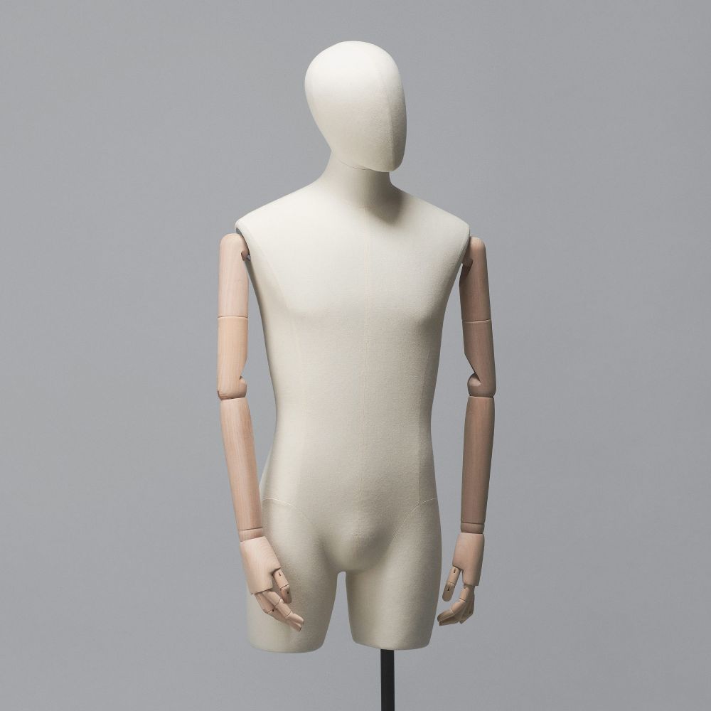 Die Schaufensterpuppe Cotton & Wood wurde vollständig aus ökologischen Materialien hergestellt. Für die Polsterung des Rumpfes und des Kopfes haben wir Baumwolle in einem warmweißen Farbton verwendet. Die helle Farbgebung des Torsos fügt sich perfekt in die moderne Einrichtung von Premium-Boutiquen ein. Die Hände mit beweglichen Gelenken haben wir aus Holz gefertigt, was eine warme Atmosphäre in jedes Geschäft bringt.