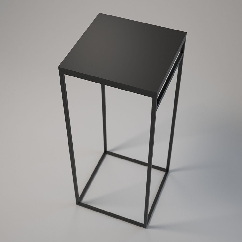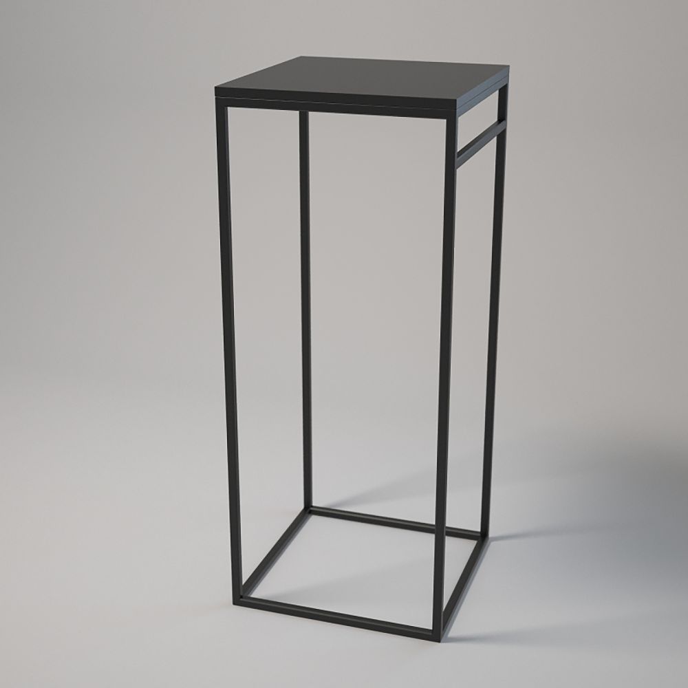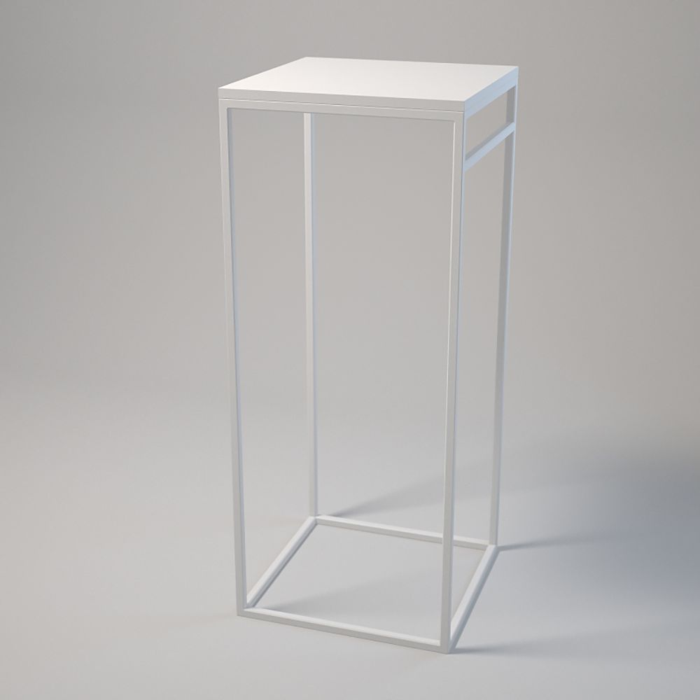 Maße: 50x50 cm, Höhe: 120 cm. Rahmen aus pulverbeschichtetem Stahl 20x20x1,5 mm. Laminierte Holzplatte mit umlaufender Kante, verschraubt. Verstellbare Möbelfüße. Farben: Weiß oder Schwarz.