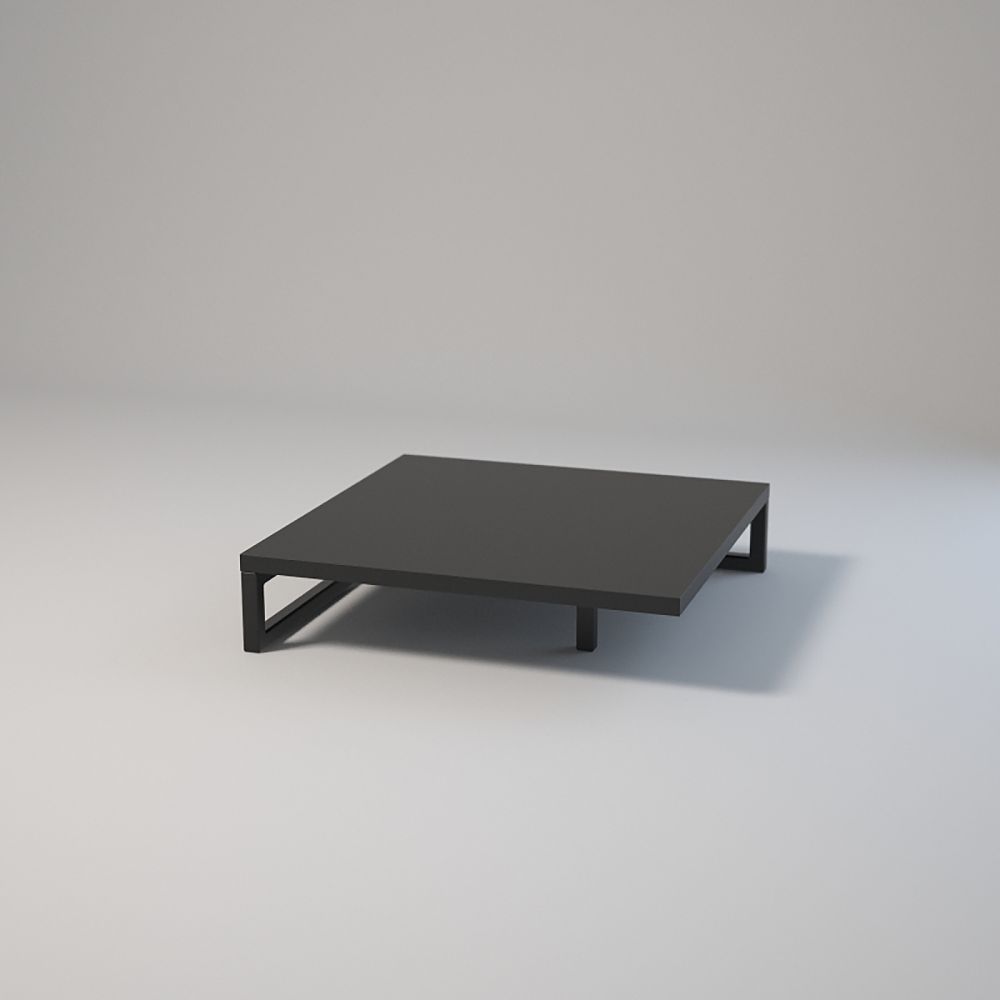 Maße: 50x50 cm, Höhe: 12 cm. Stahlrahmen aus pulverbeschichtetem Profil (20x20x1,5 mm). Deckplatte aus beschichteter Holzplatte mit Kante. Montage mit Muffen und Schrauben. Verstellbare Möbelgleiter. Farben: Schwarz oder Weiß.