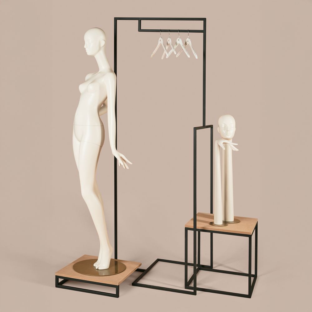 Das Modell RA220 bildet das Grundgerüst innerhalb des modularen Systems. Es kann als eigenständiges Element oder in Kombination mit Podesten, Ganzkörper-Schaufensterpuppen oder Torsen eingesetzt werden. Perfekt geeignet als Verkaufsständer für Kleidung und Accessoires oder als dekoratives Element im Store-Design – für individuelle und anpassbare Ladenmöbel.