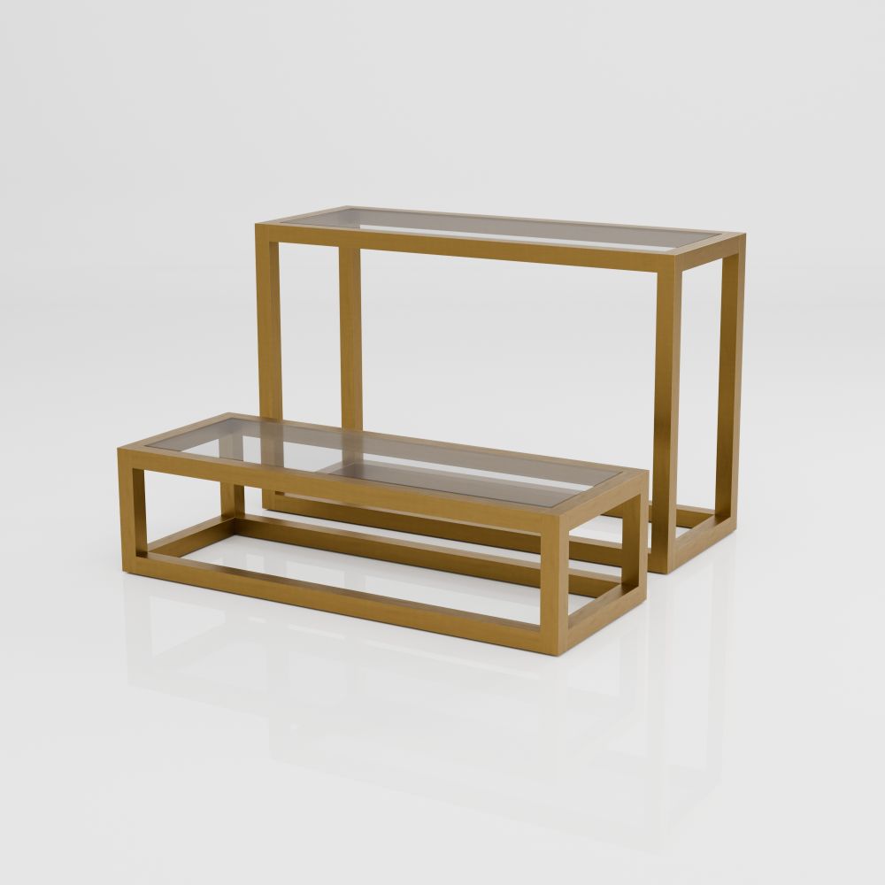 Das ES-P-10-GB Set umfasst zwei elegante Display-Ständer in unterschiedlichen Höhen und verbindet die Feinheit von transparentem Plexiglas mit markantem gebürsteten Gold. Der goldene Metallrahmen verleiht Raffinesse, während die klaren Ablagen Leichtigkeit bieten und den Fokus auf die präsentierten Produkte lenken.