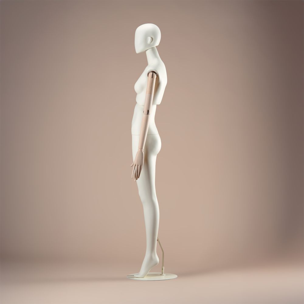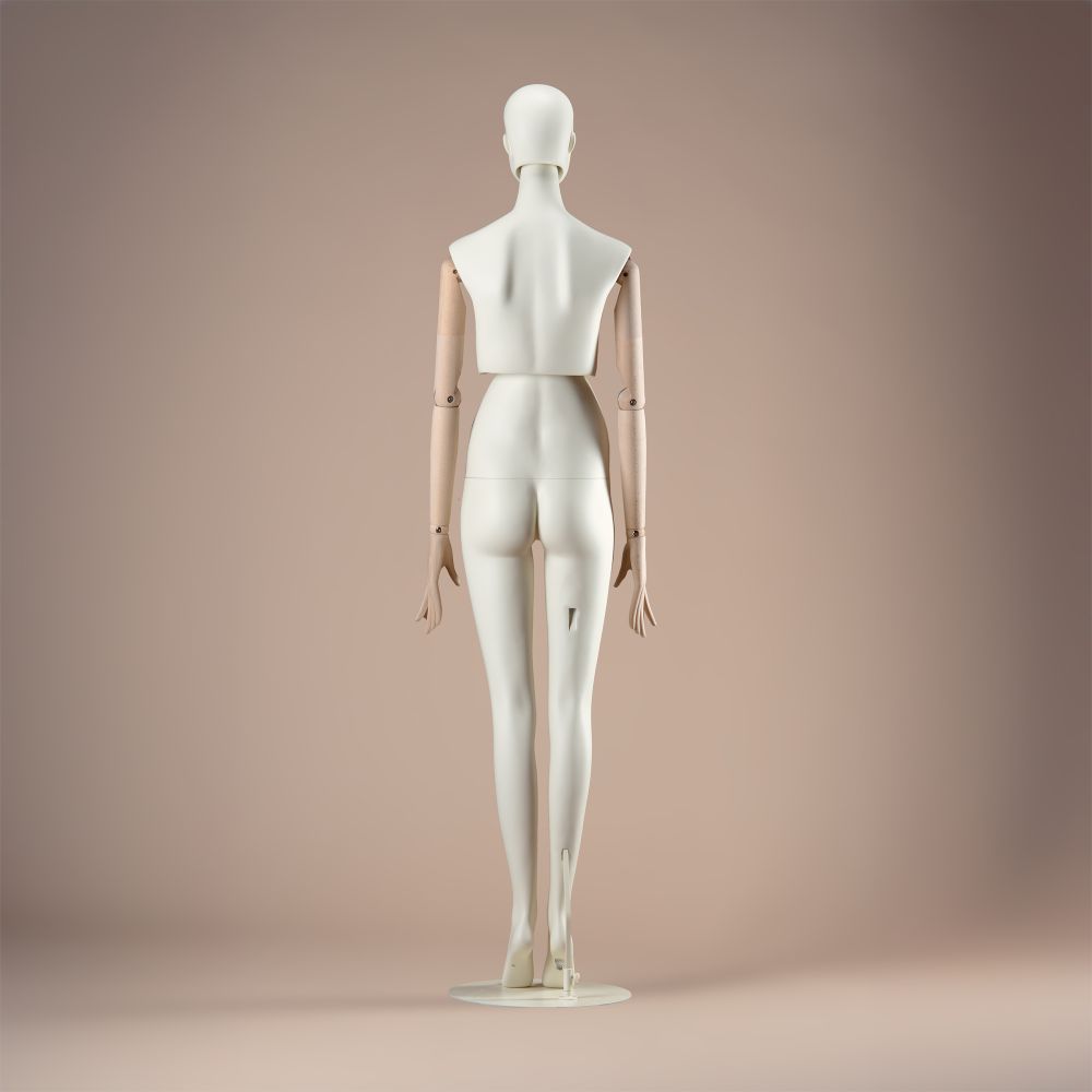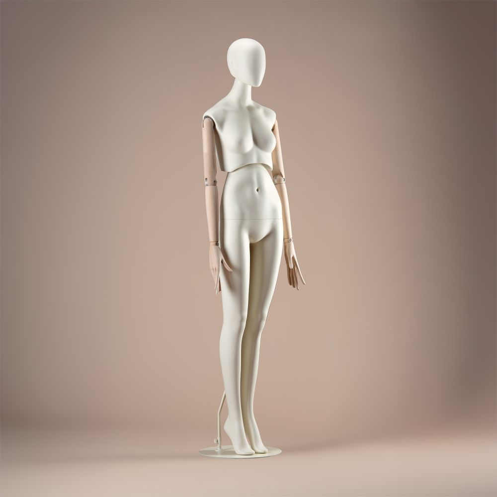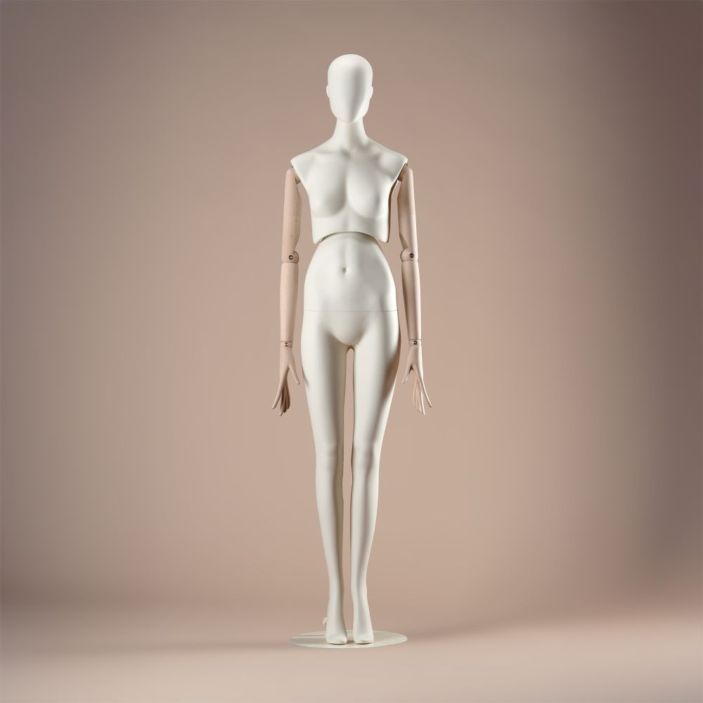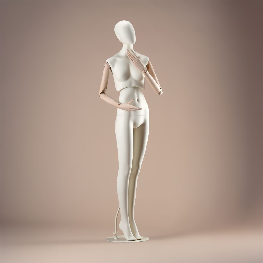 LUF1-A ist eine elegante weibliche Kleiderpuppe, die durch ihre innovative Konstruktion außergewöhnliche Flexibilität bei der Modepräsentation bietet. Der Torso kann in jede Richtung gedreht und geneigt werden, sodass Kleidung dynamisch inszeniert werden kann. Ein drehbarer Kopf mit verstellbarem Hals sowie bewegliche Holzarme mit schlanken, verlängerten Händen verleihen dieser weiblichen Schaufensterfigur eine besondere Ausdruckskraft. Die Ausführung in gebrochenem Weiß (RAL9010) macht sie perfekt für hochwertige Boutique-Interieurs.