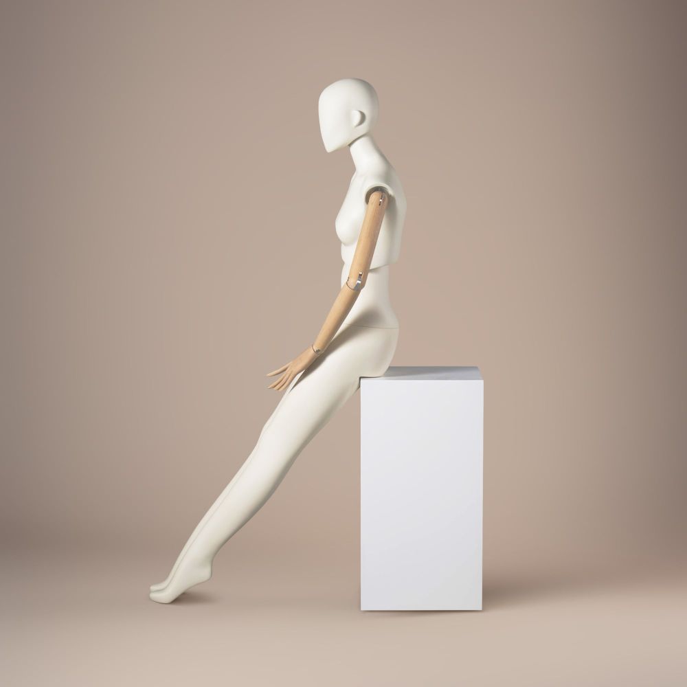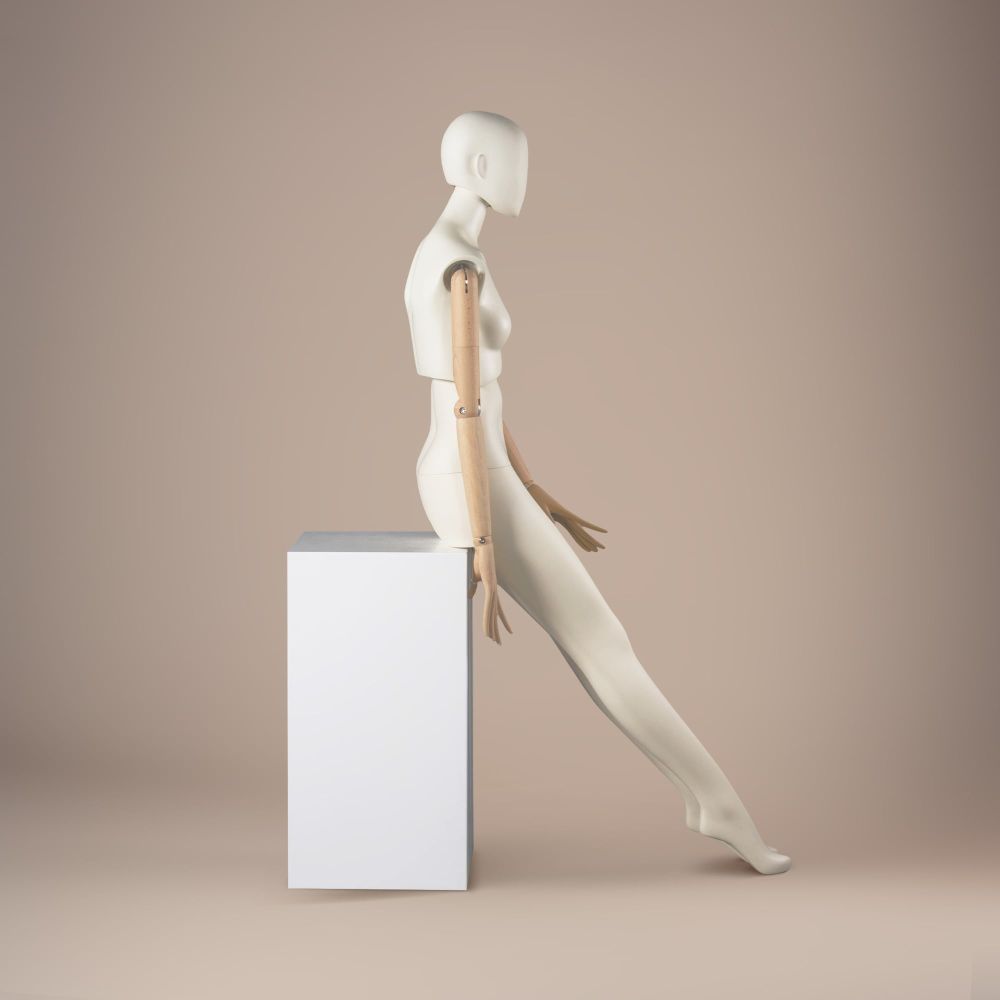 LUF2-A ist eine stilvolle weibliche Schaufensterpuppe, entworfen für hochwertige Präsentationen. Dank der innovativen Konstruktion bietet sie maximale Flexibilität – der Torso kann gedreht und geneigt werden, um Kollektionen dynamisch zu präsentieren. Der bewegliche Kopf mit einstellbarem Neigungswinkel sowie die natürlichen Holzarme mit fein modellierten Händen verleihen ihr einen besonderen Charakter. Mit der Oberfläche in gebrochenem Weiß RAL9010 passt sie perfekt in moderne Boutiquen und Ausstellungsräume.