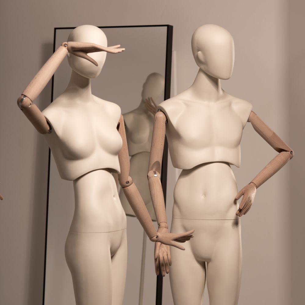 Obwohl die Haltung schlicht erscheint, eignet sich die männliche Schaufensterfigur LUM1-A hervorragend für dynamische Präsentationen. Eine leichte Verdrehung des Torsos simuliert eine Drehbewegung, während der Kopf zur Seite geneigt werden kann, um einen natürlichen Blickkontakt mit der Umgebung zu erzeugieren. Für eine ausdrucksstarke Haltung kann der Körper aufgerichtet, das Kinn angehoben und die Arme auf die Hüften gelegt werden. Eine weitere Möglichkeit besteht darin, den Torso nach vorne zu neigen, um eine Interaktion mit Accessoires darzustellen – als würde die männliche Kleiderpuppe nach etwas greifen oder es betrachten. Durch durchdachte Positionierung wird eine visuelle Erzählung geschaffen, die Kunden anspricht und eine wirkungsvolle Präsentation verschiedener Elemente der Kollektion ermöglicht.