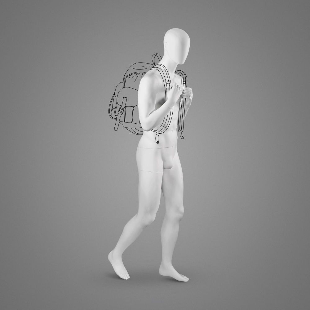 Eine Schaufensterpuppe männlich, die die Figur eines Wanderers darstellt, der mit einem Rucksack ausgestattet werden kann. Die robusten Hände sind aus modernem PVC-Material und die gesamte Silhouette ist aus beschädigungsresistentem FRP-Material gefertigt.