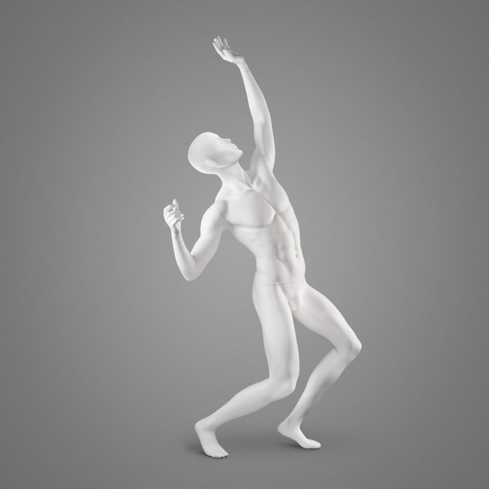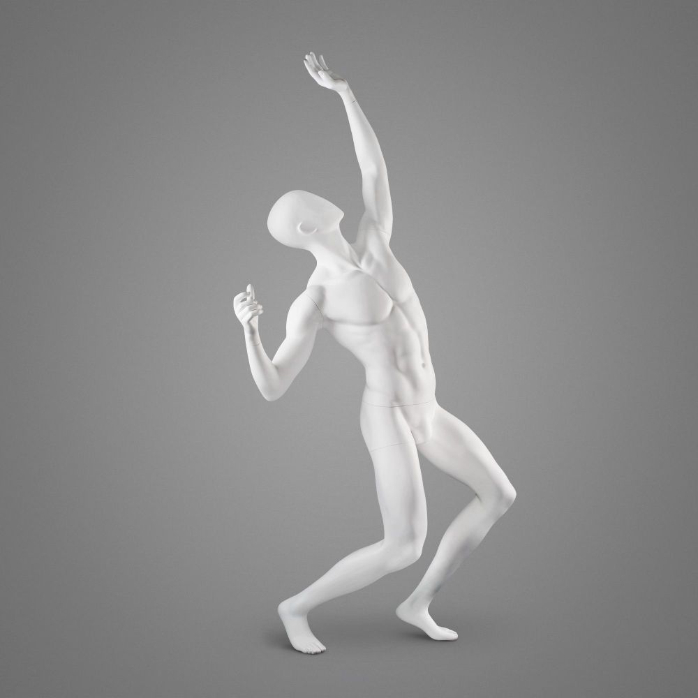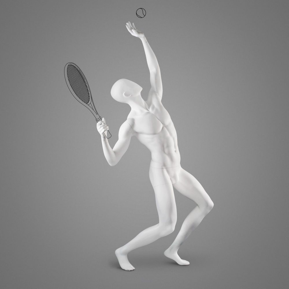 Der Tennisspieler STM44 ist eine Schaufensterpuppe in Form eines Mannes, die in jeder Farbe mit matter oder glänzender Oberfläche bestellt werden kann. Die für die Herstellung verwendeten Materialien sind Glasfaserverstärkte Kunststoffe und PVC. Das Schaufenstermodell hat ergonomische Befestigungen und ist mit einer kaum sichtbaren Wadenbefestigung an der Metallbasis befestigt. Trotz seiner dynamischen Position ist es sehr stabil und widerstandsfähig gegen äußere Einwirkungen, was durch die Anti-Kratz-Beschichtung noch verstärkt wird. Der Kopf der Schaufensterpuppe kann abstrakt oder semi-abstrakt sein.