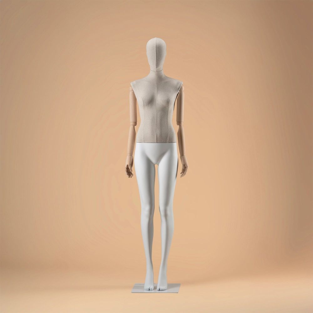 FB1-F: Umweltfreundliche Schaufensterpuppe mit stoffbezogenem Torso und hölzernen, beweglichen Armen