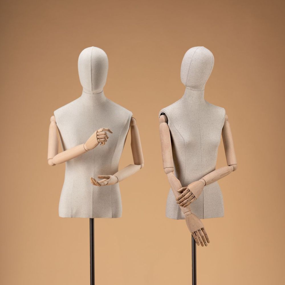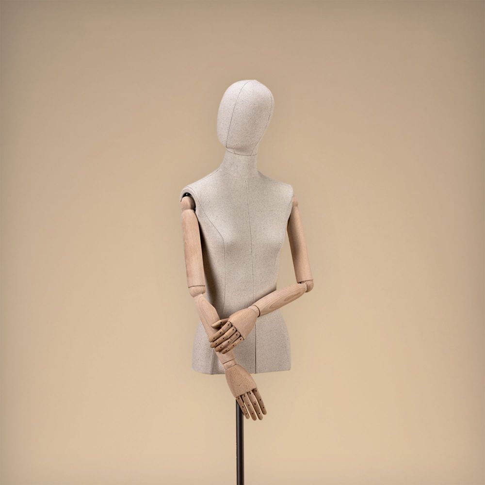 Unser Torso-Mannequin ist mit Holzarmen ausgestattet, die volle Anpassung ermöglichen. So lassen sich die Arme problemlos an das präsentierte Produkt anpassen und attraktive Arrangements erstellen. Ob Kleidung, Schmuck oder Accessoires – die verstellbaren Arme ermöglichen dynamische Präsentationen.