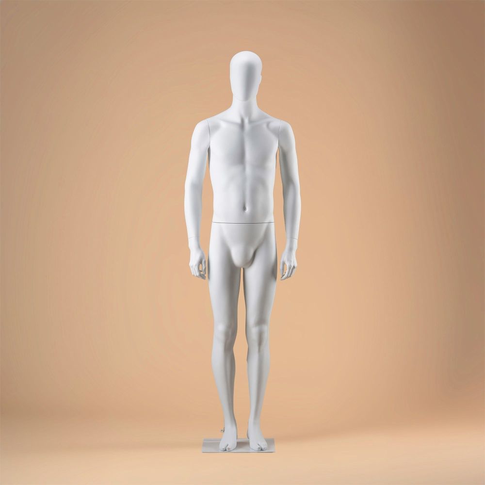 Die umweltfreundliche Schaufensterpuppe MB1-WMH aus der Serie PURE MALE zeichnet sich durch eine glatte, matte weiße Oberfläche und eine klassische, gerade Pose aus. Dieses Modell ist so konzipiert, dass eine Vielzahl von Kleidungsstilen nahtlos dargestellt werden kann.